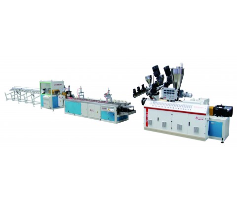 生产线由锥形双螺杆挤出机、真空定型台、切割机、翻料架组成。